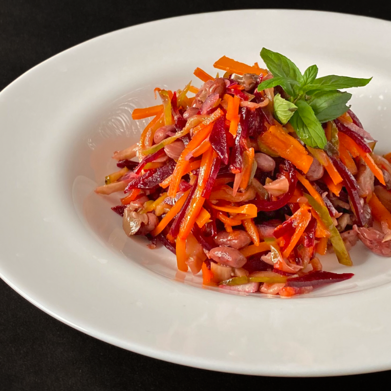 Салат с маринованными вёшками, фасолью, свёклой, морковью и солёным огурцом, 250 гр.